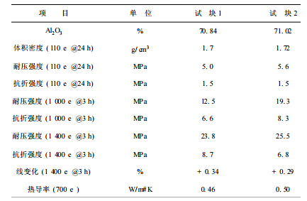 同一品種的原料體積密度較大的輕骨料,其澆注料有較高的耐壓強度和抗折強度。不同廠家的生產(chǎn)工藝不同,輕骨料本身的強度也有較大的差別,選擇何種原料應該通過檢驗澆注料試塊來決定。輕質(zhì)莫來石澆注料的主要技術(shù)指標見表2。