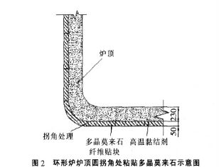 (8)爐頂圓拐角處粘貼多晶莫來石纖維貼塊,應(yīng)將貼塊按圓角處的形狀現(xiàn)場彎曲成原爐襯圓角形狀,確保貼塊的粘貼強(qiáng)度和此處的密閉、保溫效果,如圖2所示。