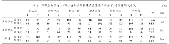 增加輻射傳熱,減少熱損失,降低燃料消耗多晶莫來石纖維的黑度為0.95,環(huán)形加熱爐內(nèi)襯粘貼多晶莫來石纖維后,爐內(nèi)熱輻射明顯增強(qiáng),提高了爐子的加熱能力和管坯的加熱速度,尤其是環(huán)形爐加熱Φ220及以上大管坯時效果更為明顯。為了檢驗(yàn)、對比使用效果,施工前、后(在同一生產(chǎn)條件下)分別在環(huán)形爐6個生產(chǎn)工藝段的內(nèi)、外環(huán)爐墻鋼板以及爐頂上各選定2個測溫點(diǎn)用紅外測溫儀進(jìn)行測溫,將測試溫度記錄并進(jìn)行比較,見表3。
