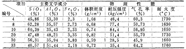 配方的選擇:以漂珠為主要原料,加入不同量軟質粘土,并用高鋁礬土來調節制品的含量,再加入少量鋸木屑及 其它添加劑,通過試驗尋求體積密度分別為0.5、0.6、0.7、0.8、0.9及l.Og/cm3的各種配方。經試驗篩選出6個較理想的配方。 試制的樣品呈淡黃或深黃色,表面致密,沒有裂紋,強度較高。試樣主要技術指標列于表3。