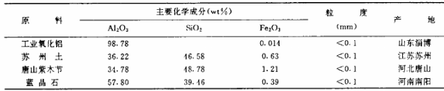 選用工業(yè)氧化鋁和蘇州土為主要原料,少量加入唐山紫木節(jié)和藍(lán)晶石。原料的化學(xué)組成見表1。