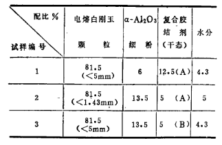 試驗所用的顆粒為電熔白剛玉,細(xì)粉部分為α-Al2O3,它們的化學(xué)組成列于表1、電熔白剛玉破碎成<5mm和<1.43mm兩種顆粒、α-Al2O3磨成<0.088mm的細(xì)粉 按表二的配比制作了三種試樣。