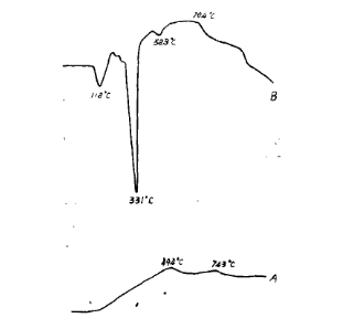 由上述數(shù)據(jù)中冷態(tài)強度的突變可以認(rèn)為:莫來石約在1000℃時形成,這也可以用熱力學(xué)計算加以證明,例如γ-Al2O3與無定形SiO2之間形成莫來石的△G900k已為-38.2千焦。而α-Al2O3與無定形SiO2之間形成莫來石的△G1100k則為-0.26千焦。也就是說,α和γ-Al2O3只要充分活化后滿足動力學(xué)條件,則分別可以在827℃和327℃就能形成莫來石了。但是由圖2的1000℃×3h燒后的試樣中并不能觀察到晶態(tài)莫來石的存在,對此,我們認(rèn)為:在如此低的溫度下,雖然莫來石可以形成,但由于擴散量很小,所以形成的初生態(tài)或非化學(xué)計算莫來石并不能長大成為足以觀察到的莫來石晶體,但卻已發(fā)揮了其較大的結(jié)合強度,為了進(jìn)一步證實我們這一推測,我們對A、B兩種復(fù)合膠結(jié)劑分別作了差熱分析、其差熱曲線如圖3所示;