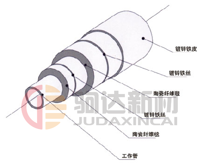 金屬保護層可根據(jù)實景情況選材,一般采用玻璃絲布、玻璃鋼、鍍鋅鐵皮、油氈、鋁皮等。要求纏繞后的陶瓷纖維毯包裹堅實,無空隙和漏縫。